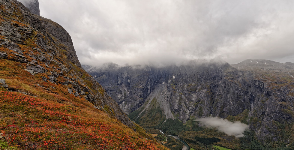 Az első helyszínre egy viszonylag rövid, de meredek és sziklás kapaszkodó után érkeztünk. Az előző nap tapasztalatai után a fotós felszerelés nagyobb részét most az autóban hagytam, de sajnos most ez bizonyult hibának; a makróobjektívet fel kellett volna vinnem. A magaslatról a völgyben kígyózó folyót és a szemben magasodó, felhőkbe burkolózó sziklafalat, a Trollok falát fotóztuk.